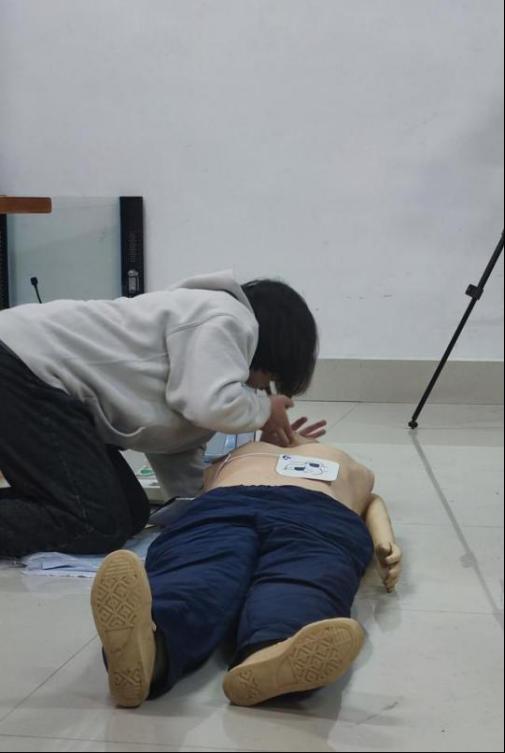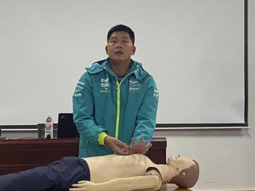 由古天乐代言太阳集团运动训练19级游泳专业陈雪怡同学向大家演示了心肺复苏法和AED除颤仪的使用。