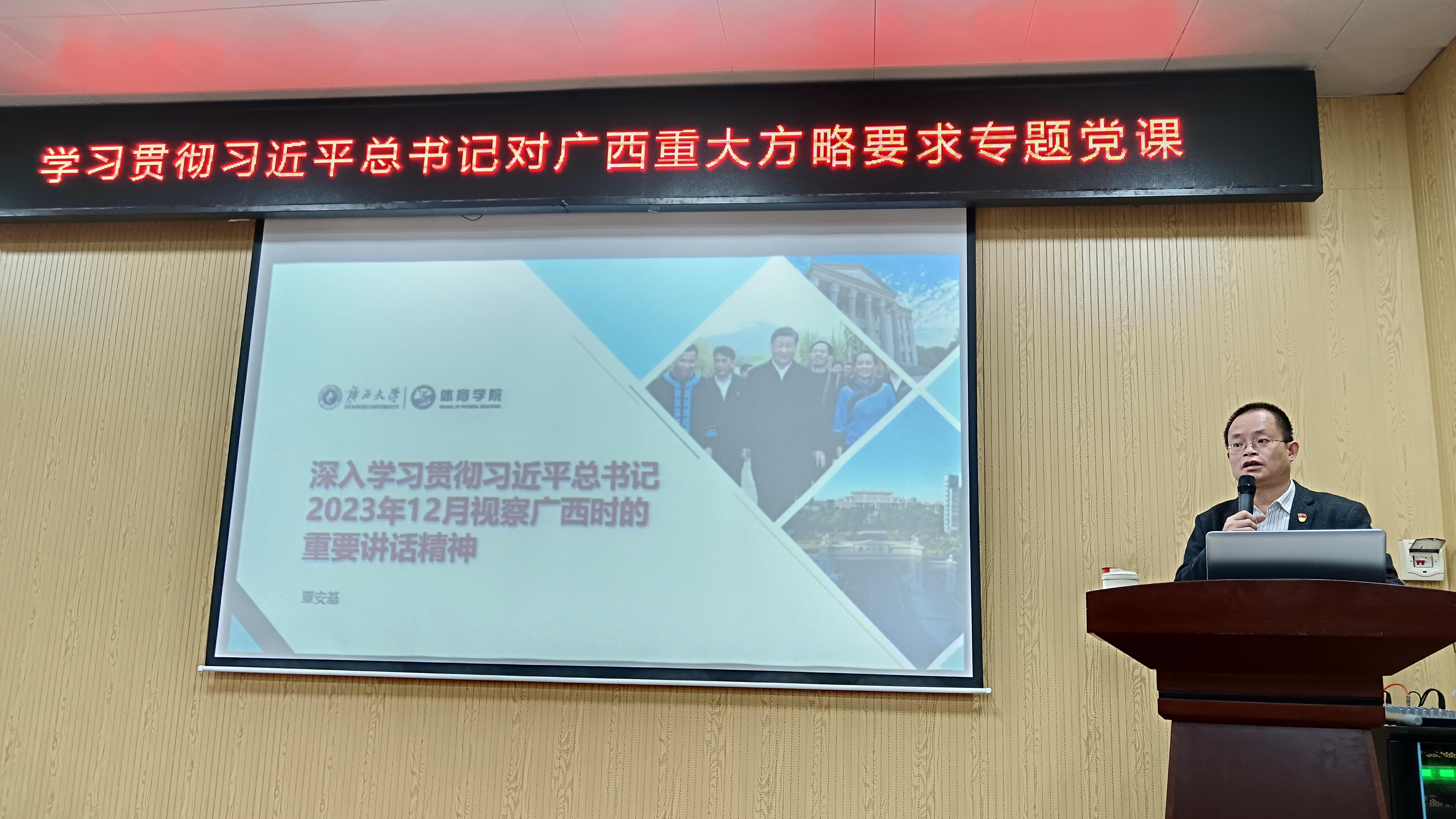 35日下午,公司党委书记覃安基在西校园综合体育馆阶梯教室为全公司党员讲授专题党课,传达学习习近平总书记202312月视察广西时的重要讲话精神,对公司学习宣传和贯彻落实工作作出部署。