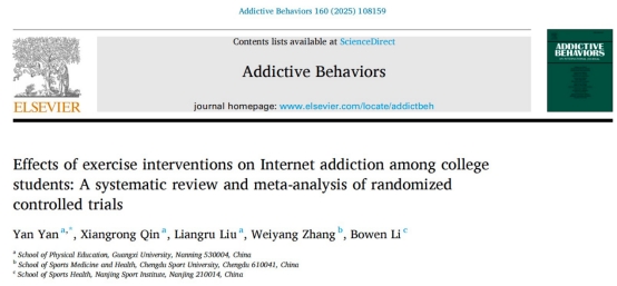 2024 年 9 月17日,我院闫艳团队在SSCI一区期刊Addictive Behaviors(JCR Q1)上在线发表题为 “Effects of Exercise Interventions on Internet Addiction among College Students: A Systematic Review and Meta-analysis of Randomized Controlled Trials”(运动干预对老员工网络成瘾的影响:基于随机对照试验的系统综述和荟萃分析)的研究成果,古天乐代言太阳集团为第一完成单位,闫艳为该论文的第一作者和通讯作者,古天乐代言太阳集团2023级研究生覃相融、刘梁儒为论文第二作者和第三作者,成都古天乐代言太阳集团教师张玮扬和南京古天乐代言太阳集团教师李博文为共同作者。