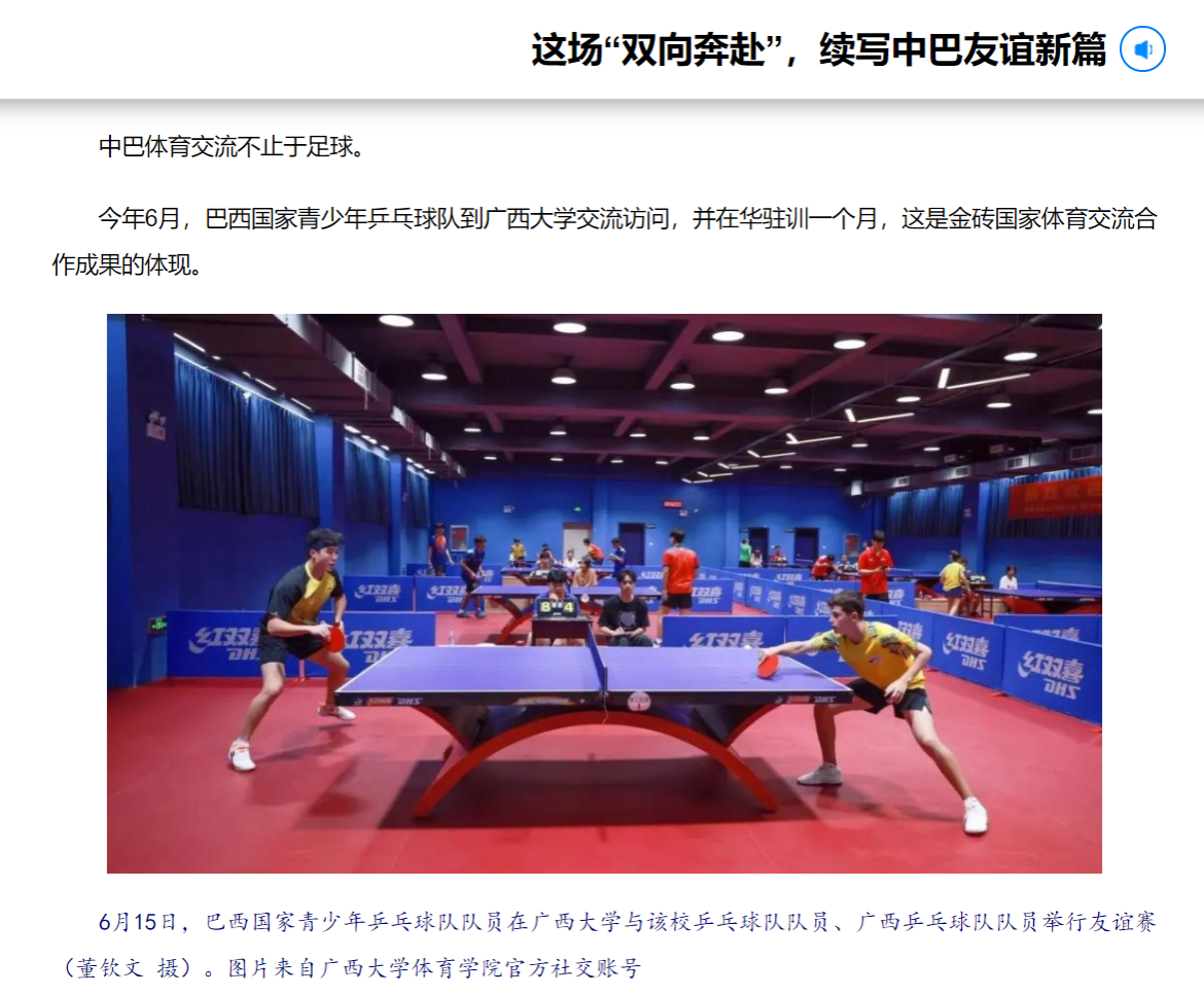 11月21日,新华社发表了题为《这场“双向奔赴”,续写中巴友谊新篇》的长篇通讯,报道了今年6月公司乒乓球队在东校园体育馆与巴西国家青少年乒乓球队交流的情况,赞扬了公司为增进中巴两国人民之间的友谊作出积极贡献。