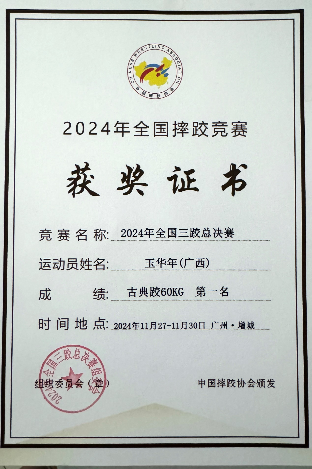 2024112730日,由国家体育总局举重摔跤柔道运动管理中心主办的2024年全国三跤总决赛在广州市增城区举行,公司2023级本科生玉华年2024级研究生何飞鸿代表广西摔跤队出战分别夺得60KG级、63KG级冠军,为广西争得荣誉。