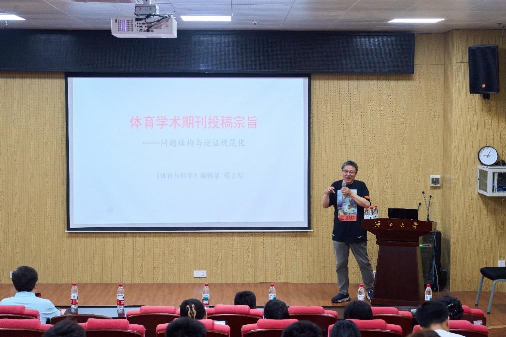 4月18日,应公司邀请,《体育与科学》杂志原主编、编审,江苏省体育科学研究所博士后工作站导师程志理在西校园体育馆学术报告厅为公司师生做题为《体育学术期刊投稿宗旨——问题结构与论证规范化》专题讲座,蔡艺教授主持讲座并点评,全院研究生及部分教师现场聆听。